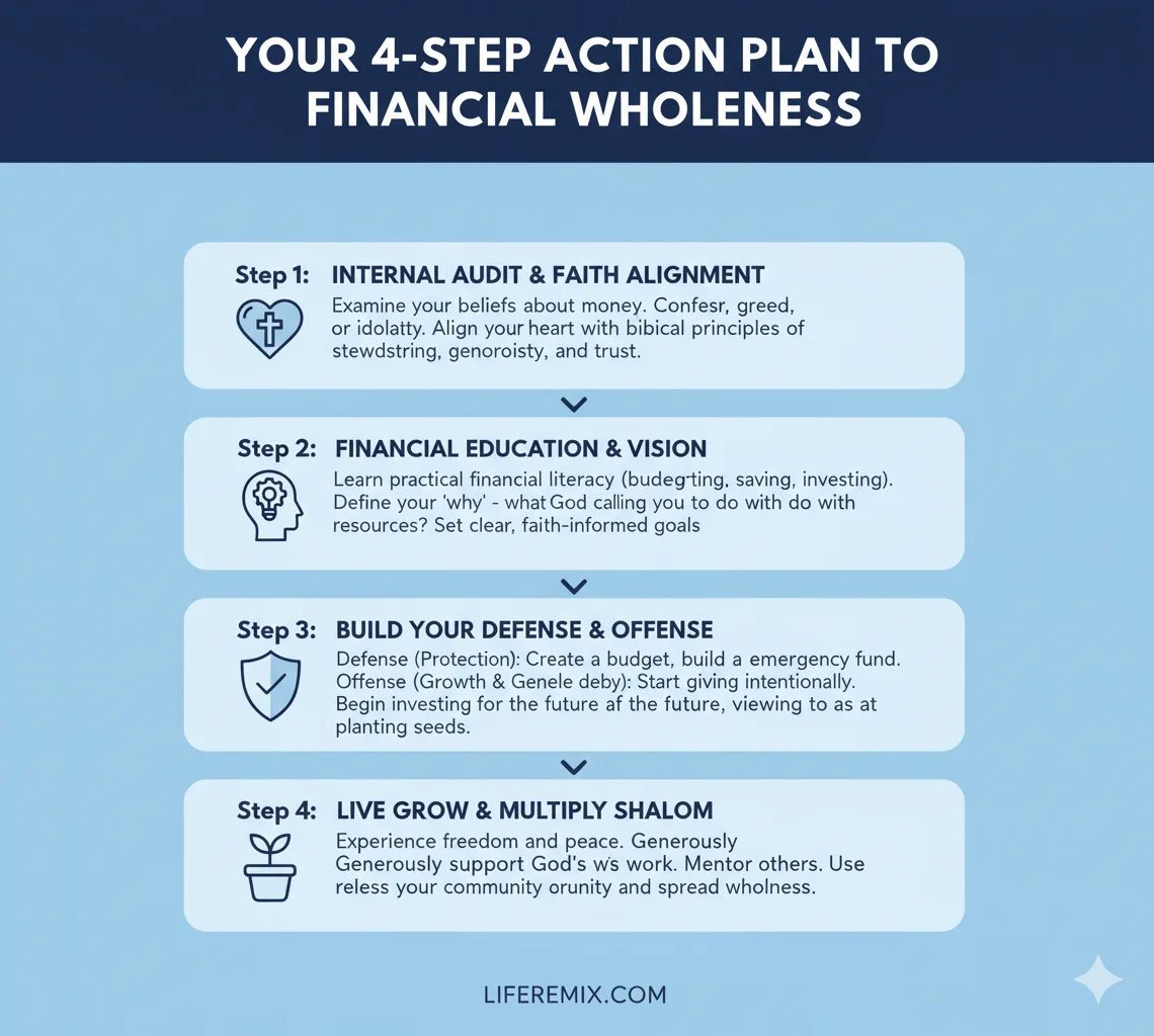 Step 1: Internal Audit & Faith Alignment * Examine Your Heart: What are your deep-seated beliefs about money? Do you fear it? Idolize it? View it as dirty or unspiritual? Confess any fear, greed, or idolatry. * Align with Scripture: Spend time in prayer and the Word. What does the Bible really say about stewardship, generosity, debt, and provision? Start aligning your heart and mind with biblical principles. This spiritual readiness is the crucial first step.